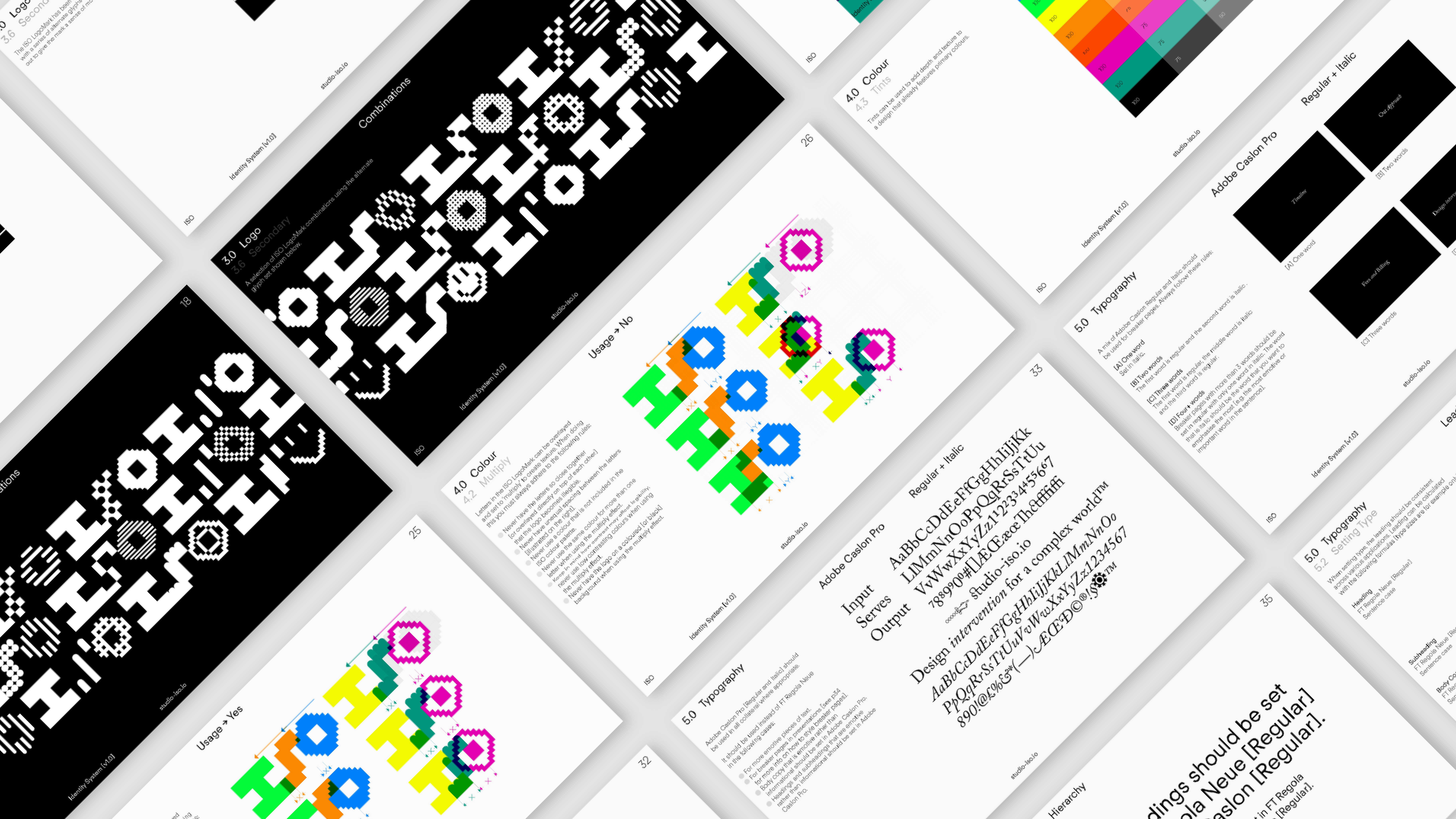 {↑} Inspiration: Caslon crafted type sits as a contrast to the brutalist ISO logotype. Caslon typographic flourishes bring a more humanist feel to the identity and wider system.
